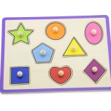 Ein lustiges und interaktives Spielzeug, das 8 bunte Teile in verschiedenen Formen enthält, jedes mit einem Griff, was die Handhabung mit kleinen Händen erleichtert. Das Spielzeug ist aus hochwertigem Holz gefertigt, was seine Langlebigkeit garantiert. Die verwendeten Materialien und Farben sind umweltfreundlich und völlig sicher für Kinder.