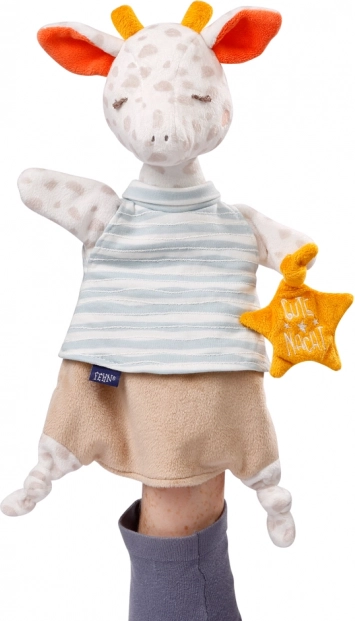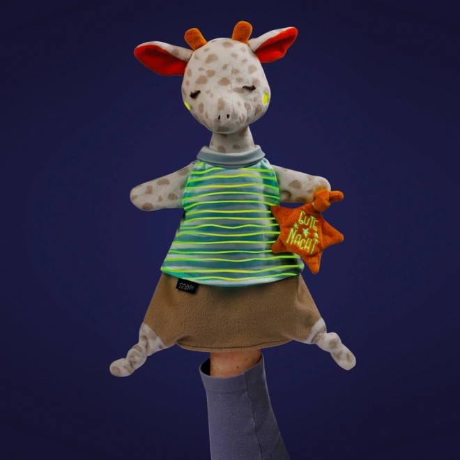 Tagsüber ein kuscheliges Plüschtier, abends ein Geschichtenerzähler und Beschützer für einen ruhigen Schlaf – das ist die Handpuppe Giraffe aus der Kollektion Gute Nacht. Das niedliche Plüschtier aus weichem Velours wird ein treuer Begleiter für Ihr Kind sein. Es kann als Handpuppe verwendet werden, mit der Sie Ihr Kind neue Fähigkeiten lernen lassen, ihm Gute-Nacht-Geschichten erzählen oder einfach seine Vorstellungskraft und Fantasie fördern können. Die leuchtenden Elemente vermitteln dem Kind ein Gefühl von Sicherheit und helfen ihm, besser einzuschlafen.