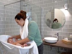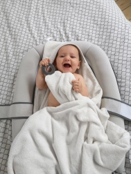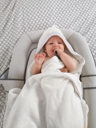 Das flauschige Kapuzenhandtuch Doomoo Dry&Play ist nicht nur ein gewöhnliches Handtuch. Dank der cleveren Silikon-Ringschnalle können Eltern es sich leicht um den Hals legen, haben so die Hände frei für ein bequemes und sicheres Waschen des Babys und sind außerdem vor Spritzern geschützt. Nach dem Baden kann das Baby bequem im Handtuch eingewickelt werden, und der Silikonring dient als Beißring.
