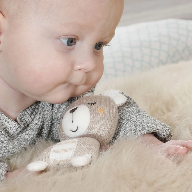 Der weiche Plüschbär besteht aus Bio-Baumwolle und ist ideal zum Greifen und Kuscheln. Der spezielle Holzgriff ermöglicht es, den Plüschfreund leicht zu halten, und weckt bei Kindern die Neugier zu entdecken und zu spielen. Die Rassel fördert den Tastsinn, das Hörvermögen und die motorischen Fähigkeiten des Kindes.