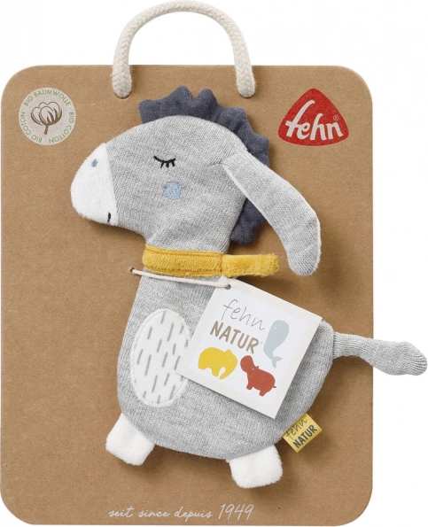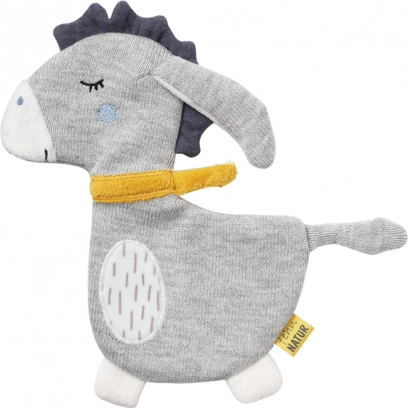 Der gehäkelte Eselkörper besteht aus Bio-Baumwolle und im Inneren befindet sich Knisterpapier, das beim Drücken Geräusche macht. Das Greifspielzeug fördert auf spielerische Weise das Gehör, den Griff- und Tastsinn sowie die Feinmotorik des Babys. Die praktische Größe ermöglicht es, den Esel überallhin mitzunehmen.