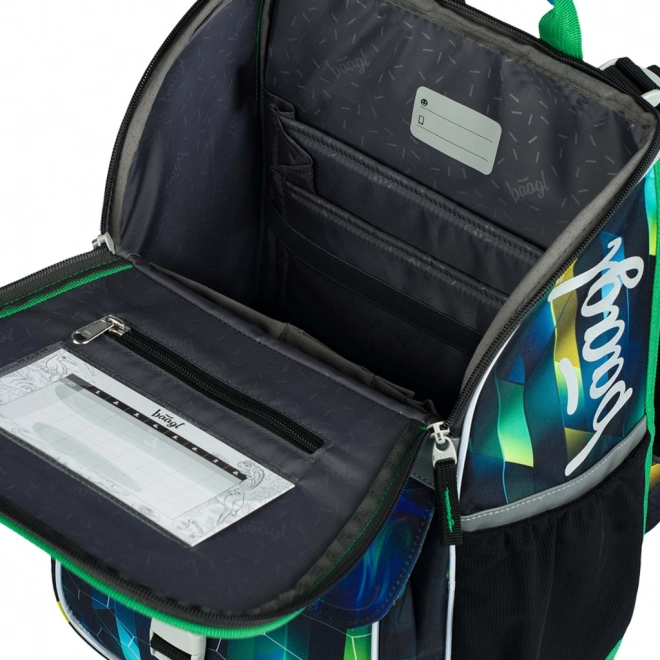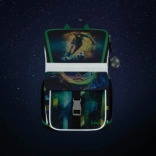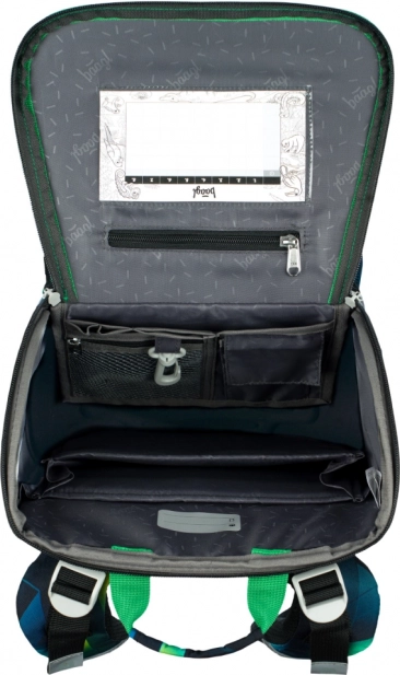 Die durchdachte Innenaufteilung umfasst ein aufklappbares Öffnungssystem für den einfachen Zugriff direkt aus der Bank, eine transparente Tasche für den Stundenplan, einen inneren Organizer mit Gummiband und eine isolierte Fronttasche für die Brotzeit. Seitentaschen aus festem Material fassen eine Trinkflasche, während der feste Boden sicherstellt, dass der Ranzen selbstständig steht.