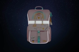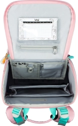 Das neue aufklappbare Öffnungssystem ermöglicht den Zugriff auf die Utensilien direkt von der Schulbank aus. Innen befindet sich eine transparente Tasche für den Stundenplan, ein Organizer mit Gummiband und eine isolierte Fronttasche mit Schnalle.