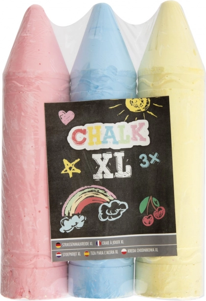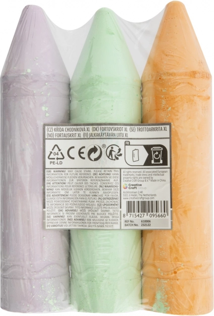 Bereichern Sie Ihre Zeichenaktivitäten mit diesen bunten XL-Kreiden, die in zwei Varianten erhältlich sind - gelb, blau und rosa oder orange, grün und violett. Jede Packung enthält drei Kreiden, die mit ihrer optimalen Länge von 19 cm das Halten beim Zeichnen erleichtern.