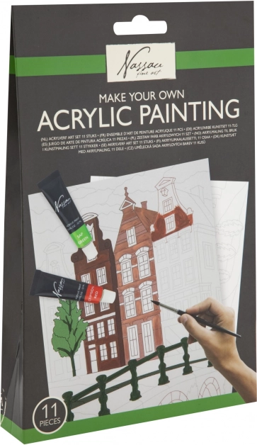 Enthält 11 Teile: verschiedene Acrylfarben, Pinsel, vorgezeichnete Leinwand und Anleitung, die Sie Schritt für Schritt durch den Malprozess führt.