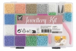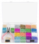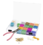 Das große Perlen-Set zur Schmuckherstellung enthält – 20 Farben Perlen, eine Zange, goldene und silberne Verschlüsse und Verbinder sowie goldene und silberne Schmuckdrähte zum Auffädeln.