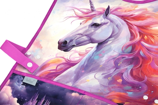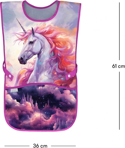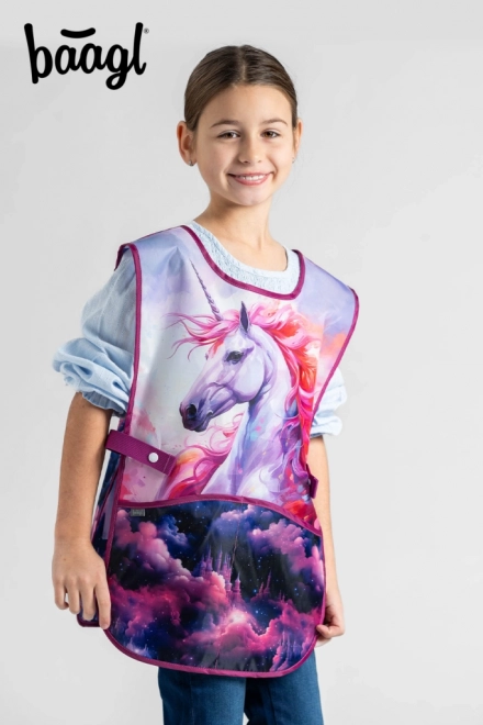 Praktische Kinder-Schürze von BAAGL mit Einhornmotiv, ideal für den Kunstunterricht, Werkunterricht und Freizeitkurse. Bietet robustes, abwischbares Material und zwei geräumige Taschen im unteren Bereich für kleine Utensilien.