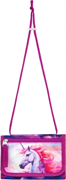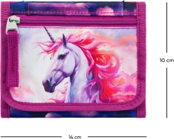 Die Innenaufteilung ist für eine übersichtliche Aufbewahrung von Scheinen, Karten und Ausweisen konzipiert; eine separate Reißverschlusstasche für Münzen fehlt nicht. Der Klettverschluss hält den Inhalt zuverlässig verschlossen. Die farbenfrohe Ausführung mit Einhorn- und Sternmotiv fällt sofort ins Auge und passt hervorragend zu weiteren Accessoires.