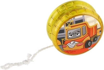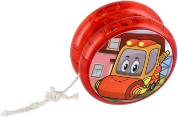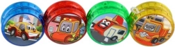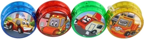 Das Jojo ist in mehreren Farbvarianten erhältlich, darunter Blau, Rot, Grün und Gelb, alle mit fröhlichen Bildern von Fahrzeugen.