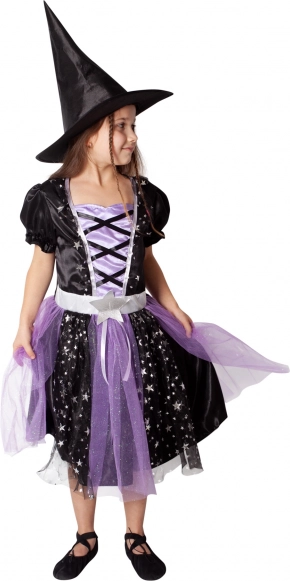 Das schwarz‑lila Kleid mit silbernen Sternchen sorgt dafür, dass Ihre kleine Hexe auf jeder Party im Mittelpunkt steht.