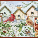 Der Blick auf verschneite Vogelhäuschen, rote Beeren und vielfältige Vogelarten schafft eine ruhige, festliche Stimmung und motiviert, Stück für Stück weiterzupuzzeln.