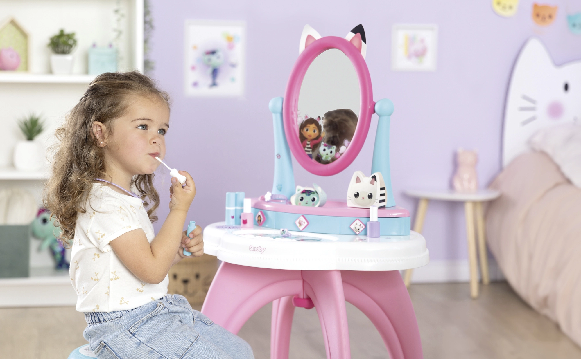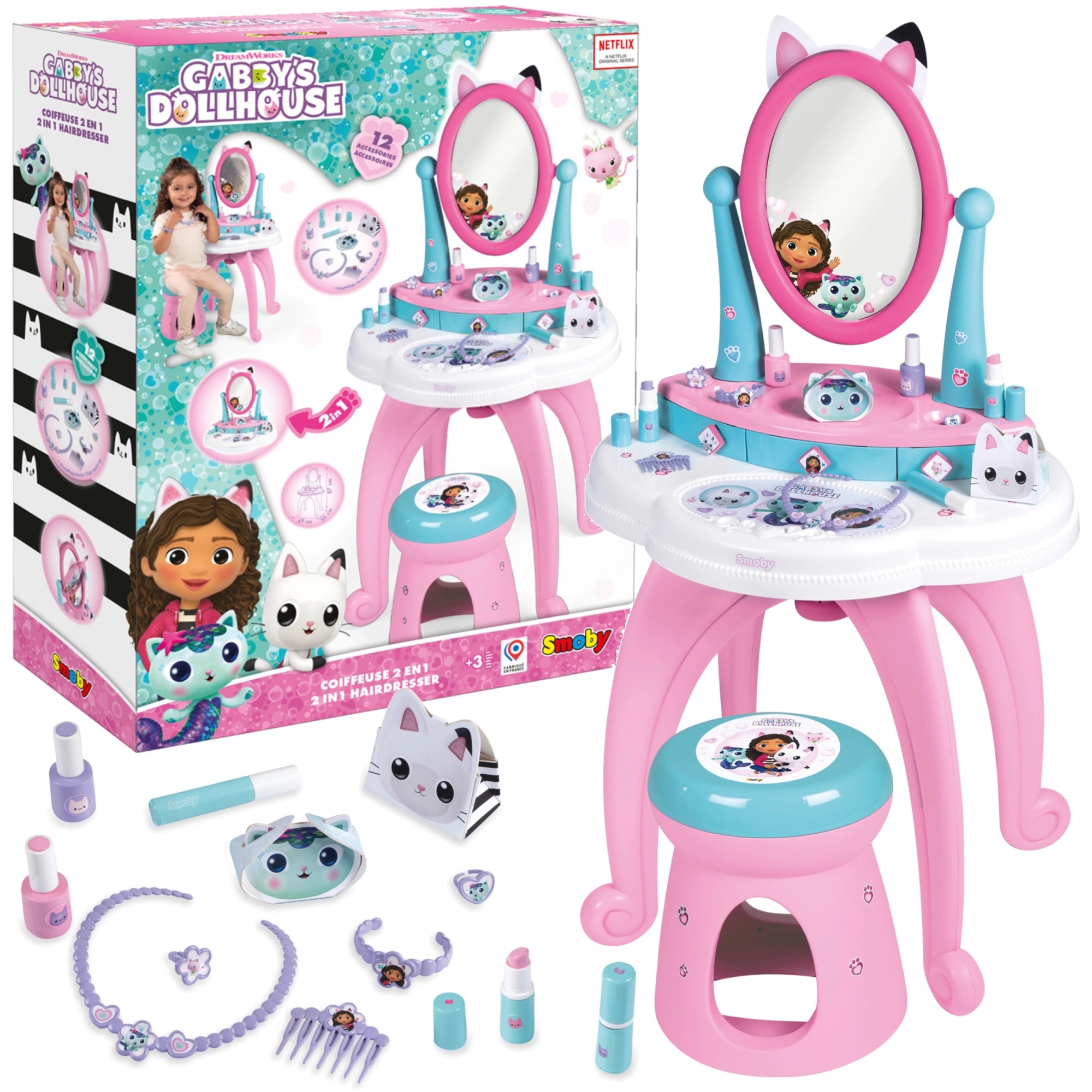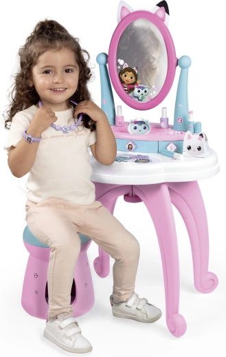 Der von der beliebten Serie GABBY’S DOLLHOUSE inspirierte Kinderschminktisch verwandelt das Kinderzimmer in ein kleines Kosmetikstudio. Dank des großen verstellbaren Spiegels, der drei Schubladen und des umfangreichen Zubehörsets ist alles griffbereit – für ein realitätsnahes und sicheres Spielerlebnis.
