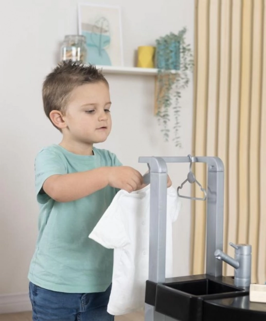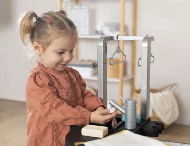 Die Kinder können vier verschiedene Bereiche nutzen: Waschmaschine, Waschbecken, Trockenbereich und Bügelbrett. Jeder Bereich ist so gestaltet, dass authentische Spielsituationen entstehen.