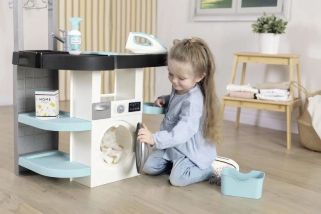 Die Kinderwäscherei mit Bügeleisen und Staubsauger Rowenta ist die perfekte Wahl für kleine Haushaltshilfen. Sie umfasst vier Spielbereiche: Waschmaschine, Waschbecken für Handwäsche, Trockenbereich und ein Bügelbrett, die Kindern mehr über häusliche Pflichten beibringen.