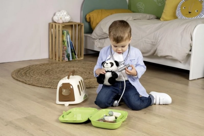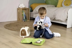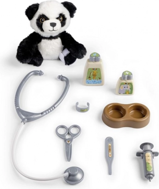 Stethoskop, Spritze, Schere, Futterschüssel, Armband und zwei Fläschchen – alles für ein realistisches Tierarzt-Rollenspiel. Inklusive weichem Plüsch-Panda als Patient.