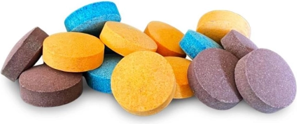Vier kräftige Farben (Blau, Rosa, Lila, Gelb) gehen beim Auflösen ineinander über und verwandeln Ihr Bad in ein spielerisches Farbtheater.