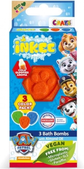 Die sprudelnden Badebomben Inkee Paw Patrol verwandeln das Bad in ein farbenfrohes, duftendes Spiel. Jede Mini-Bombe sprudelt nach und nach, färbt das Wasser und verströmt einen zarten Duft, den Kinder lieben. Dank des hinzugefügten Mandelöls helfen sie, die Haut zu pflegen und zu zartmachen.