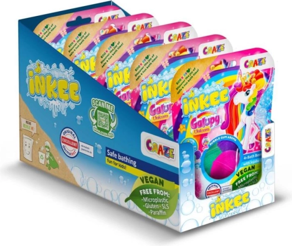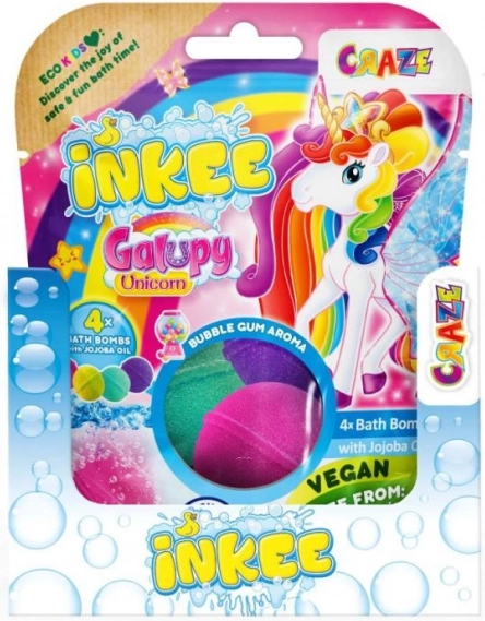 Bringe Freude und Farbe ins Kinderbad mit INKEE Galupy Unicorn. Jede Bombe sprudelt sanft im Wasser, setzt spielerische Farben und den süßen Kaugummi-Duft frei, während Jojobaöl hilft, die Haut weich zu halten.