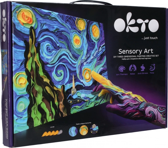 Entdecken Sie ein kreatives Erlebnis mit dem Okto Sensoty Art – Sternennacht Kreativset, inspiriert vom Meisterwerk von Vincent van Gogh. Dank der selbsthärtenden Modelliermasse (Air Clay) und der Technik des Finger-Malens gestalten Sie ein plastisches Bild mit dem Schwierigkeitsgrad 4/5. Ideal zur Förderung der Kreativität und zur Entspannung, mit einer Leinwand im Format 30 × 40 cm und allem, was Sie in der Packung benötigen.