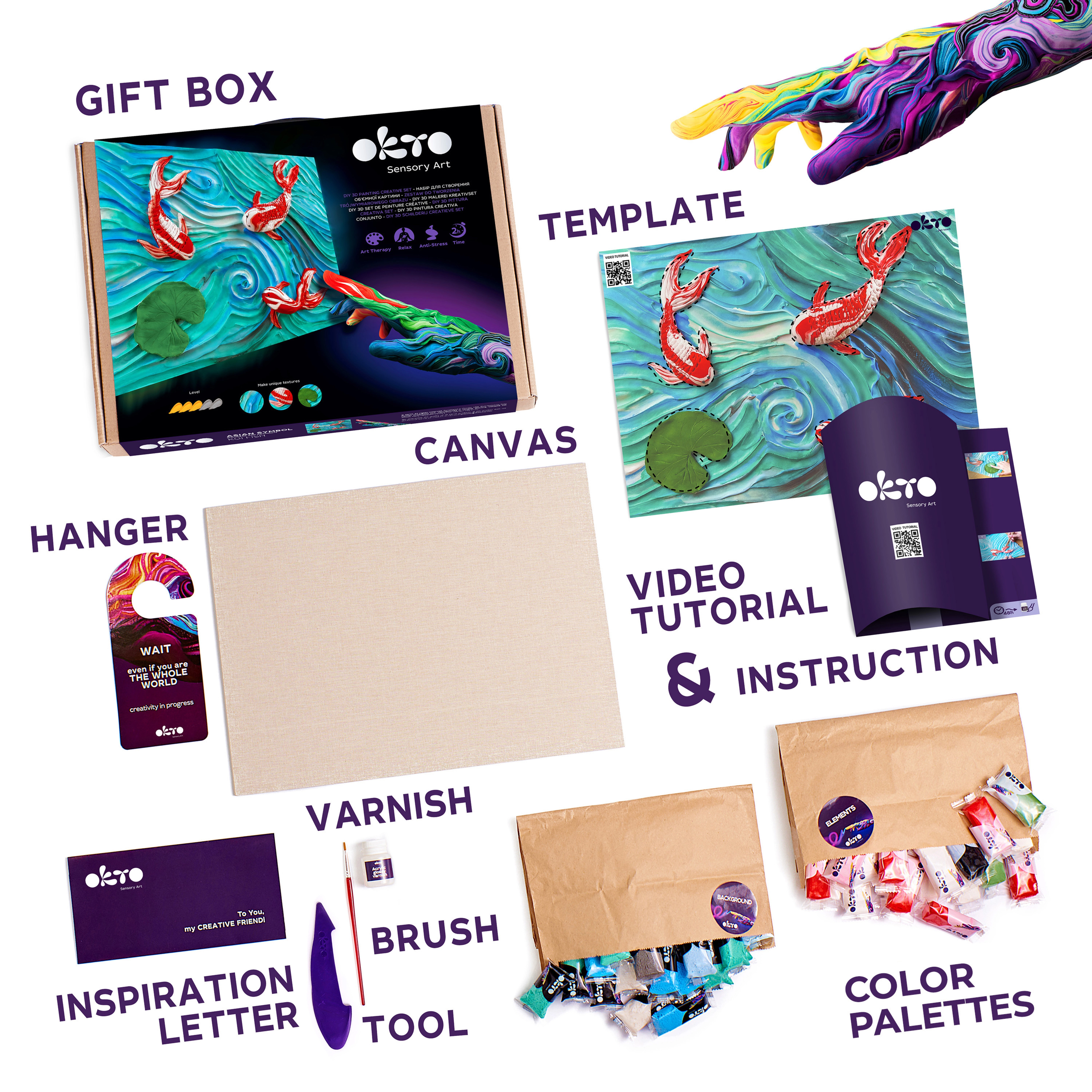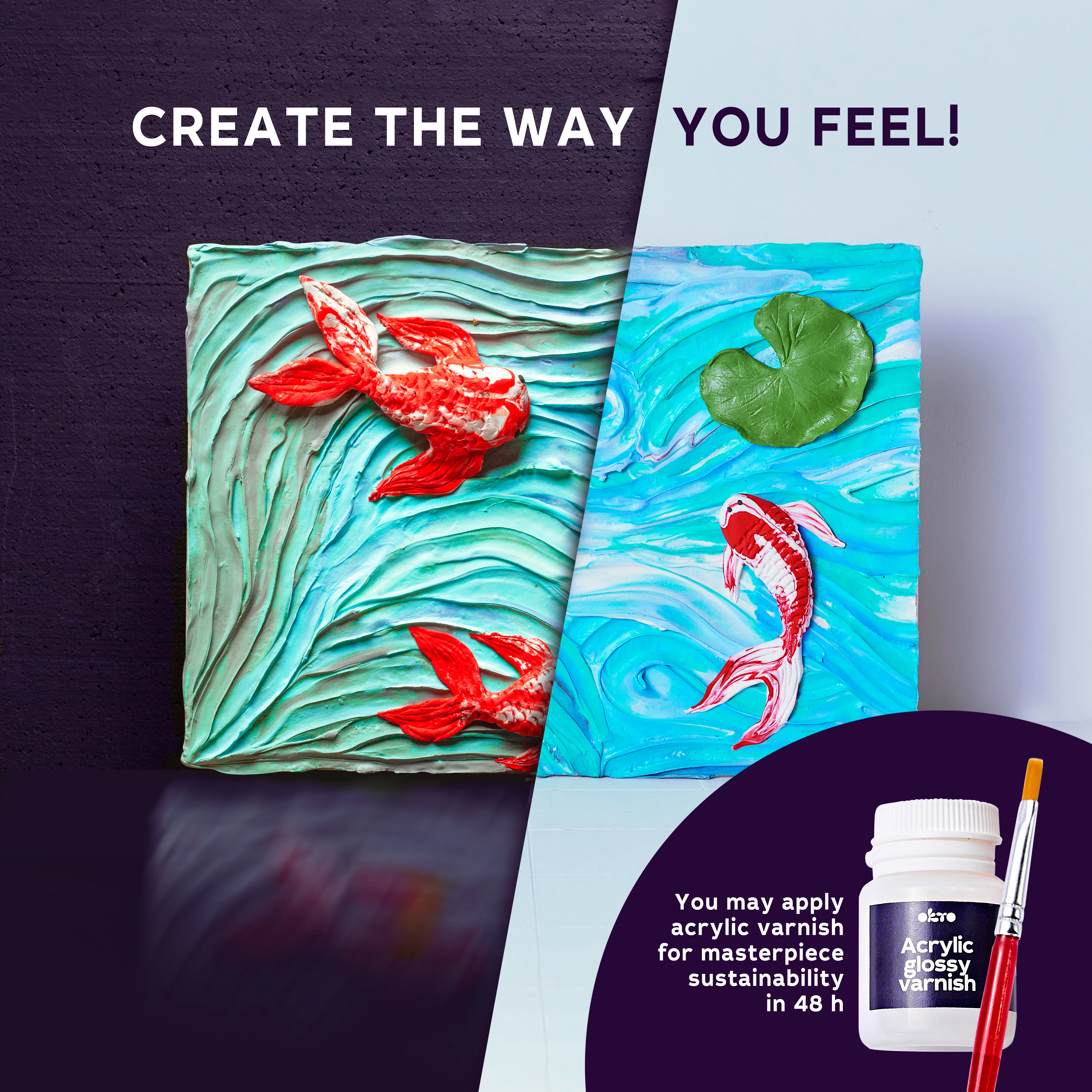 Dieses Kreativ-Set ermöglicht Ihnen, ein eindrucksvolles Bild mit dem Motiv Koi-Karpfen auf einer hochwertigen Naturleinwand im Format 30 × 40 cm zu erschaffen. Dank der beiliegenden Modelliermassen und des hölzernen Formwerkzeugs erzielen Sie mühelos einen plastischen 3D-Effekt, der Details hervorhebt und dem Werk einen einzigartigen Charakter verleiht.