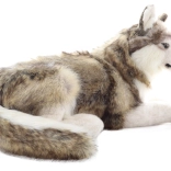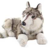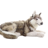 Der Plüschwolf hat ein realistisches Aussehen mit Farben und Mustern, die das echte Fell eines Wolfs nachahmen.