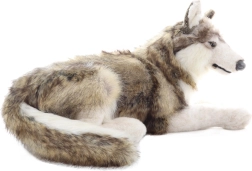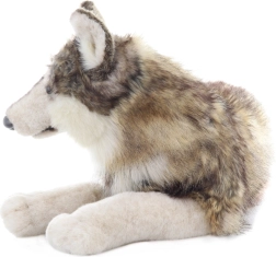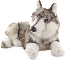 Der Plüschwolf hat ein realistisches Aussehen mit Farben und Mustern, die das echte Fell eines Wolfs nachahmen.
