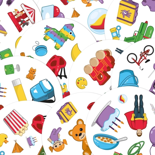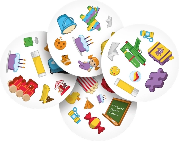 Dobble Kids ist ein Spiel, das Wahrnehmung und Reaktionsgeschwindigkeit trainiert und vollständig auf die Bedürfnisse der Jüngsten zugeschnitten ist. Das Set enthält 55 Karten mit Symbolen, die Gegenstände und Spielzeuge darstellen, mit denen Kinder jeden Tag spielen. Teddybär, Rucksack, Ball, Fahrrad, Puppe – einfache Bilder, die sich leichter benennen lassen, sodass Kinder ab 4 Jahren mitspielen können.