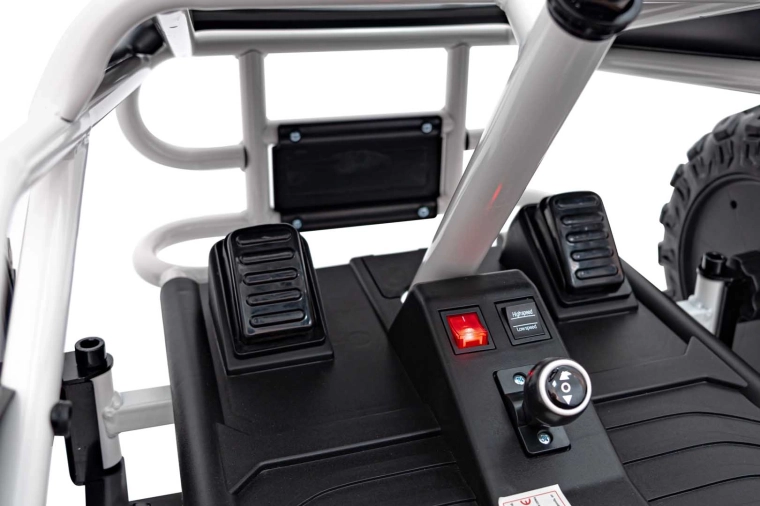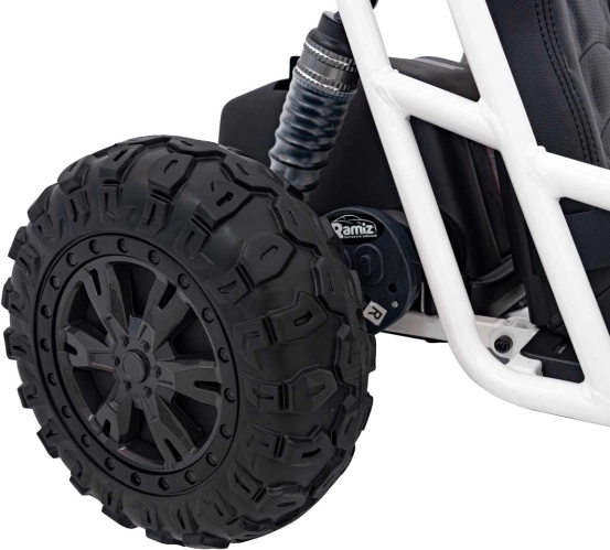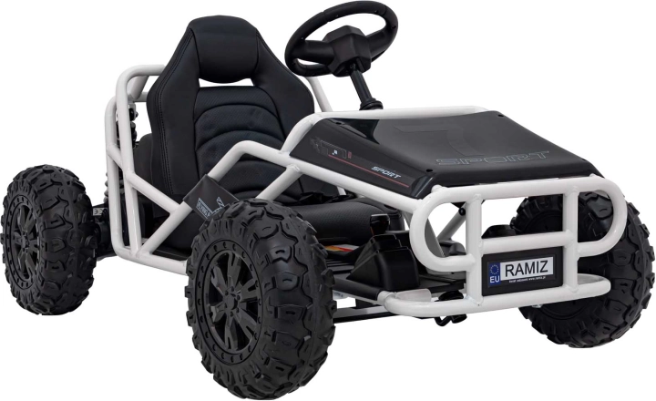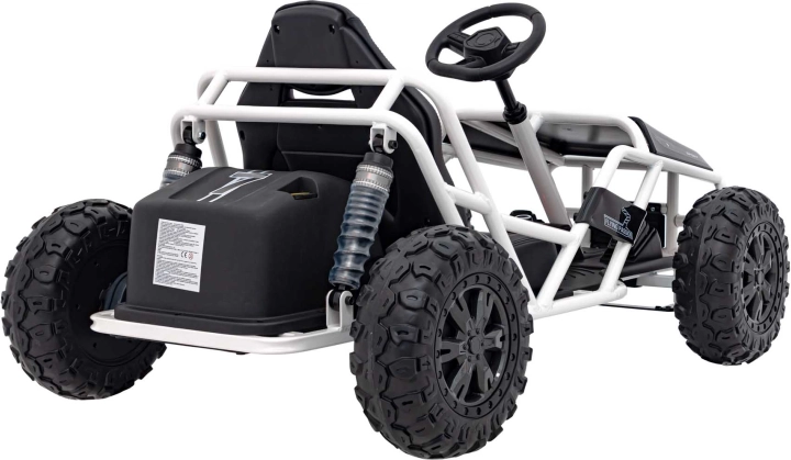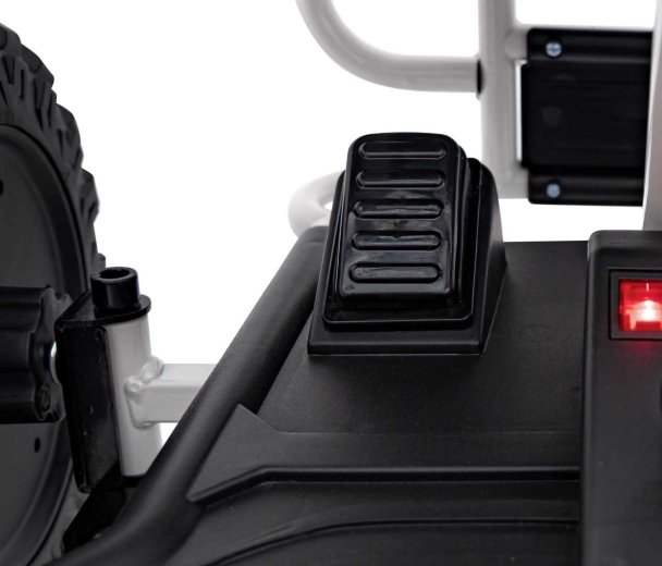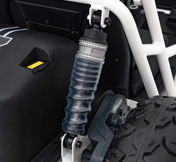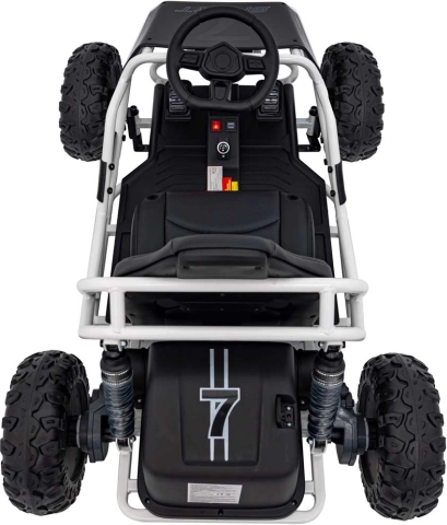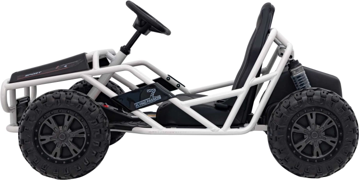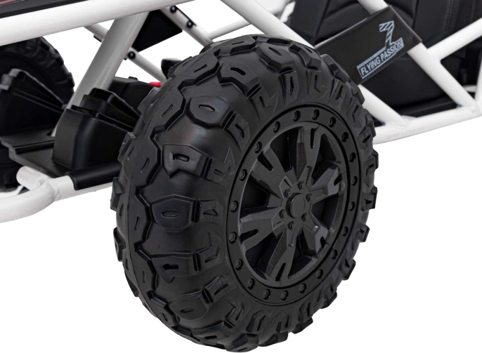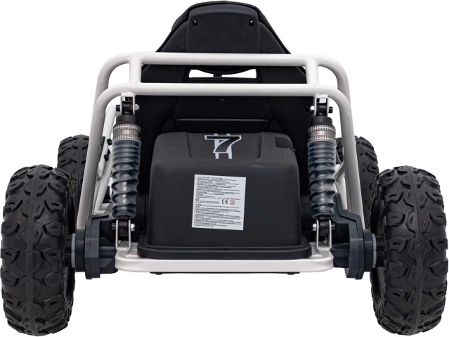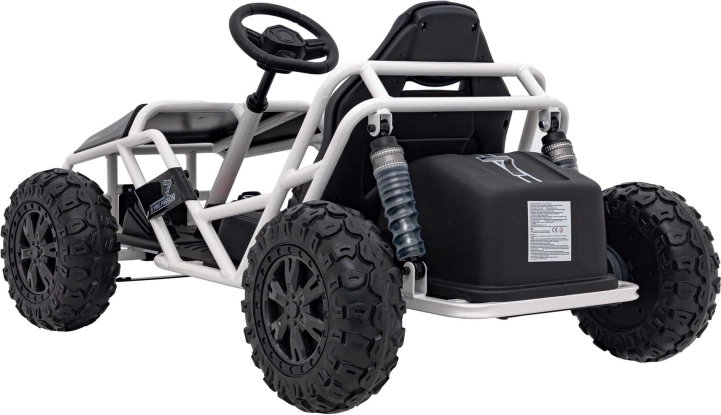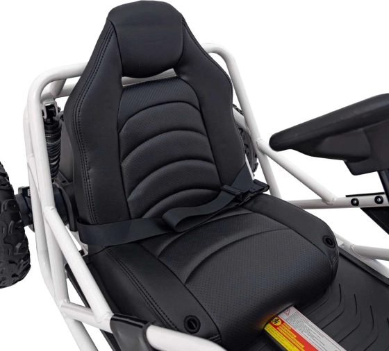 Dank großer EVA-Räder (29×11 cm), hinterer Stoßdämpfer und hoher Bodenfreiheit (15 cm) meistert das Fahrzeug Unebenheiten mit Leichtigkeit. Der geräumige Sitz aus Ökoleder mit Sicherheitsgurten erhöht Komfort und Sicherheit während der Fahrt.