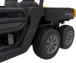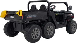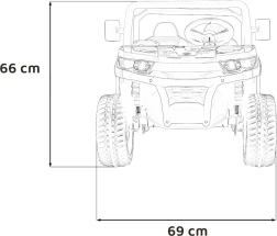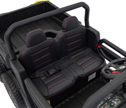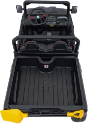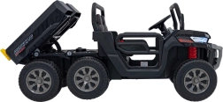 Die kleinen Fahrer freuen sich über ein realistisches Cockpit mit Beleuchtung, Sounds am Lenkrad und Multimedia-Panel (MP3/USB/AUX/Bluetooth). Die praktisch per Knopfdruck kippbare Ladefläche mit öffnender Bordwand ermöglicht den Transport von Spielzeug und kleiner Fracht. Der Sitz aus Eco-Leder sorgt auch auf längeren Fahrten für Bequemlichkeit.