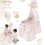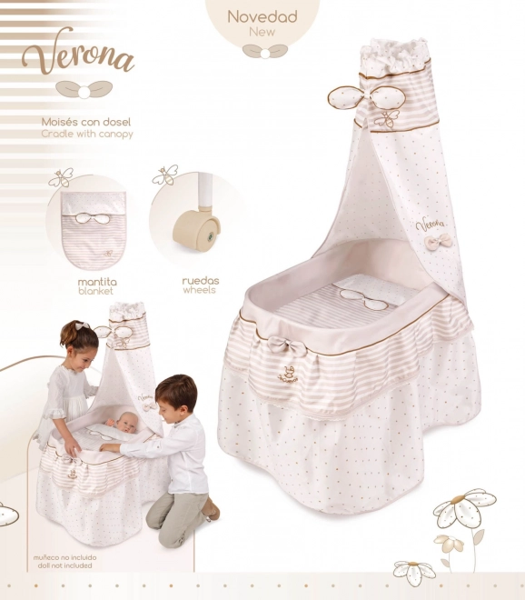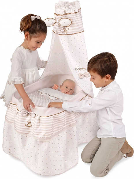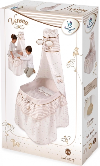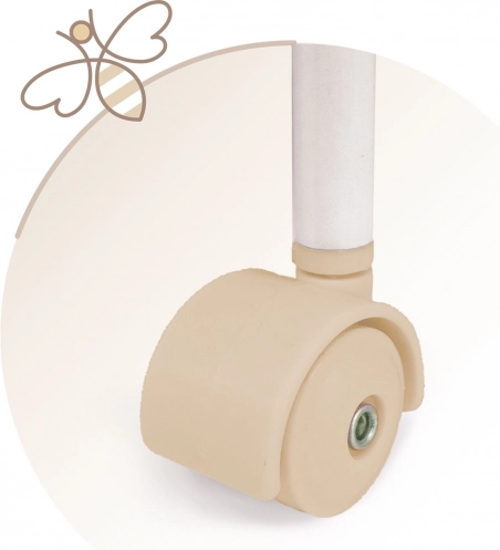 Dieses stilvolle Puppenbett ist in sanften Pastelltönen von Beige und Weiß mit dezenten Punkten und Streifen gehalten. Den natürlichen Look ergänzen Schleifchen, die an Blütenblätter erinnern, sowie kleine Stickereien von Bienchen, welche den Charme der gesamten VERONA-Kollektion unterstreichen. Dank der drehbaren Rollen lässt sich das Bett leicht von Zimmer zu Zimmer bewegen, damit die kleine Pflegerin ihr Baby immer bei sich hat.