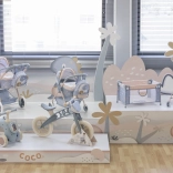 Zarte grau-blaue Töne und das Motiv einer Dino-Mama mit Baby lassen sich mit Kinderwagen und weiteren Accessoires der gleichen Kollektion kombinieren.
