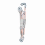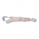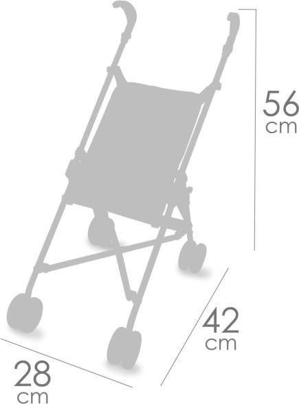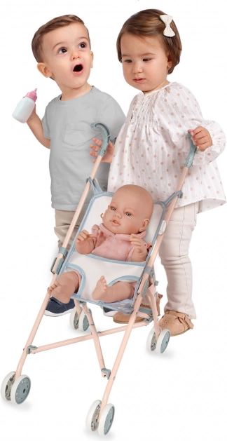 Der robuste Metallrahmen und der strapazierfähige Stoff in graublauem Ton mit sandfarbenen und rosafarbenen Details sorgen für lange Haltbarkeit und sicheres Handling. Das praktische Sicherheitssystem gegen Einklemmen der Finger schützt beim Zusammenklappen. Der Wagen ist für Puppen verschiedener Größen geeignet, und dank des Dreipunktgurts bleibt die Puppe stets sicher an ihrem Platz.