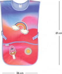 Zwei untere Taschen halten Pinsel und Buntstifte griffbereit. Ein verstellbares Nackenband und Bindebänder in der Taille sorgen dafür, dass die Schürze gut sitzt.