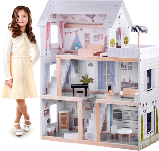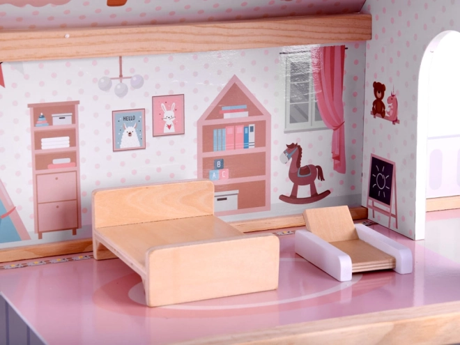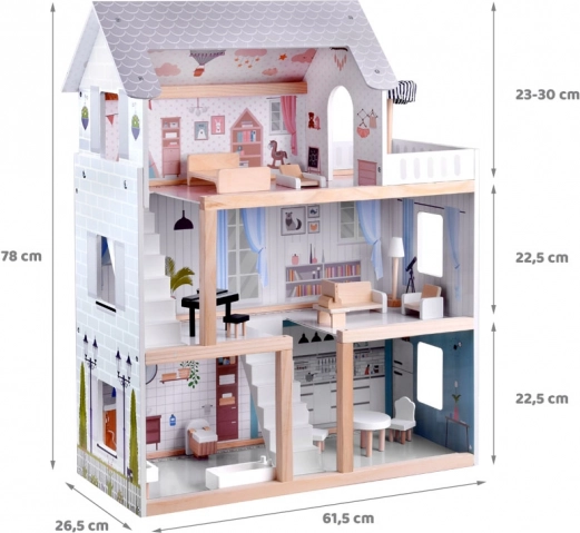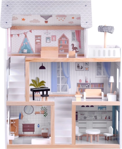 Dieses Holzpuppenhaus wurde entworfen, um Kinder zu kreativem Spiel und zum Erzählen von Geschichten zu inspirieren. Es bietet ein Erdgeschoss mit Küche und Bad, eine erste Etage mit Wohnzimmer und Leseecke mit Musikbereich sowie einen Dachboden mit niedlichem Kinderzimmer und großer Terrasse. Die zarte Boho-Ästhetik, Illustrationen und Holzelemente wirken beruhigend.