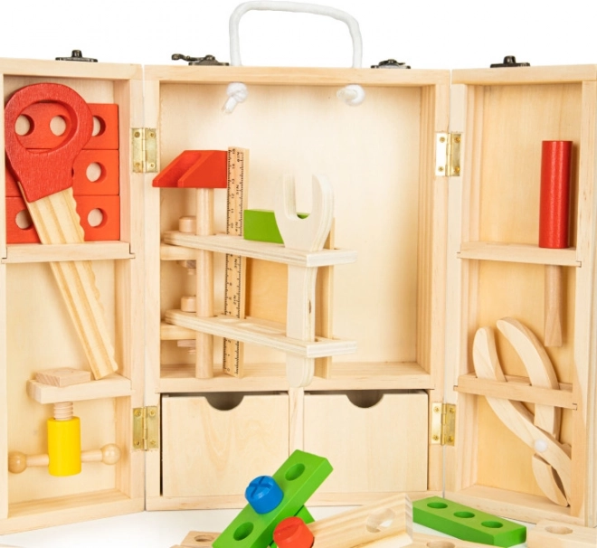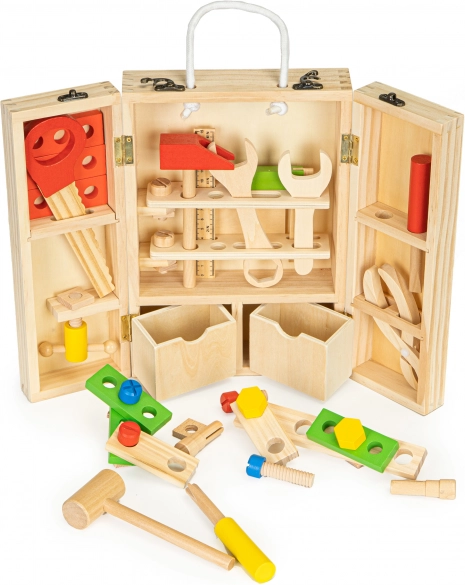 Die Kiste enthält spezielle Fächer und eine klappbare Wand mit Halterungen für die Werkzeuge, was einen einfachen Zugriff und Ordnung ermöglicht. Mit einer Vielzahl von Komponenten kann Ihr Kind einfache Konstruktionen bauen und seine Fähigkeiten in Bereichen wie Schreiben, Zeichnen oder Anziehen verbessern.