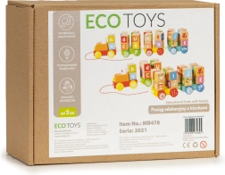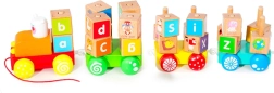 Der Zug enthält 26 Holzwürfel, die mit großen und kleinen Buchstaben des Alphabets sowie verschiedenen Bildern markiert sind. Kinder können aus den Würfeln einfache Wörter bilden, Türme bauen oder sie auf die Waggons legen, und wenn sich der Zug bewegt, beginnen sich die Würfel um ihre Achse zu drehen, was sicherlich die Aufmerksamkeit jedes Kindes auf sich zieht.