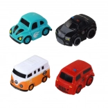 Ein Set aus vier kleinen Autos in verschiedenen Stilen und Farben fördert motorische Fähigkeiten und Vorstellungskraft.