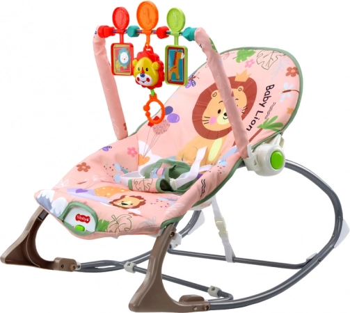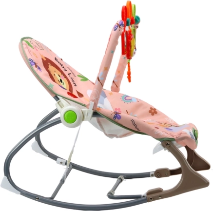 Die Wiege ist mit einem rosa Textilbezug mit Löwenmotiv und bunten Blumendesigns ausgestattet, die die Aufmerksamkeit jedes Babys auf sich ziehen.
