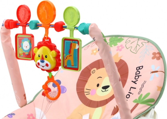 Die Wiege ist mit einem angenehmen rosa Stoffbezug ausgestattet, der mit einem niedlichen Löwen- und bunten Blumenmotiv verziert ist. Zur Wiege gehört ein bunter Spielbogen, der hängende Tierfiguren wie einen Löwen und eine Giraffe umfasst und die Interaktion des Kindes fördert.