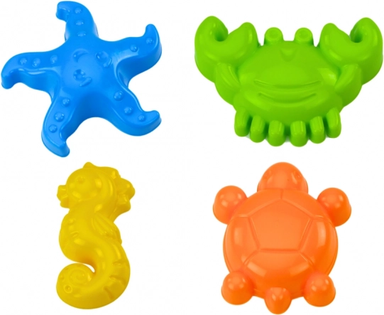 Vier Förmchen in Form von Meerestieren ermöglichen es Kindern, vielfältige Sandskulpturen zu erschaffen und gleichzeitig etwas über das Meeresleben zu lernen.