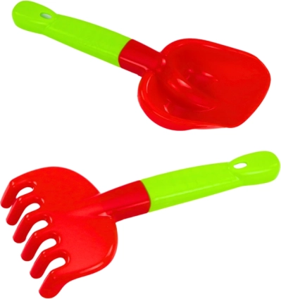 Das Set umfasst eine Schaufel und einen Rechen, die die körperliche Aktivität und die Feinmotorik der Kinder beim Spielen im Sand oder in der Erde fördern.