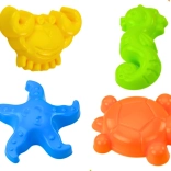 Enthält Förmchen in Form von Krabbe, Seepferdchen, Seestern und Schildkröte für kreatives Gestalten im Sand.