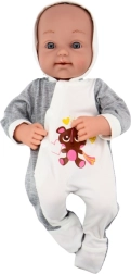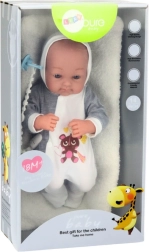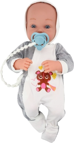 Zum Set gehört auch ein blauer Schnuller an einer gestrickten Schnur und eine weiche Decke für noch mehr Freude an der Pflege. Das Spiel mit der Puppe erweitert die Fantasie der Kinder und lehrt sie, wie man sich um ein Baby kümmert, was ihre soziale Entwicklung stimuliert.