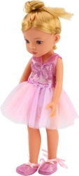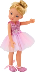 Die Puppe hat langes blondes Haar und ein rosa glitzerndes Kleid, das ihr ein realistisches Ballett-Aussehen verleiht.