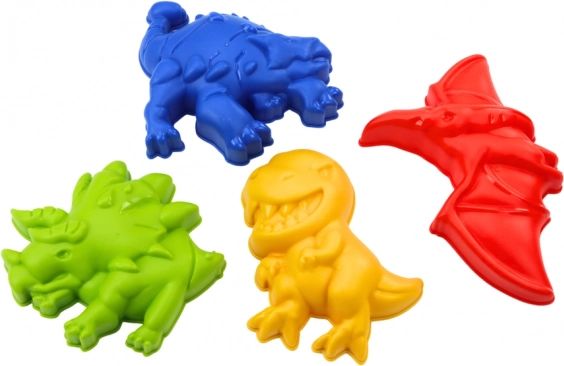 Vier farbige Förmchen in Dinosaurierform regen die Fantasie an und verwandeln jede Sandlandschaft in ein prähistorisches Abenteuer.