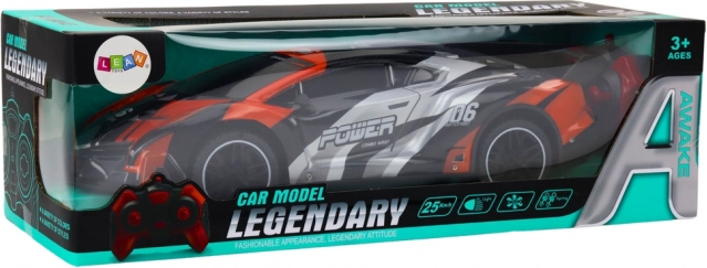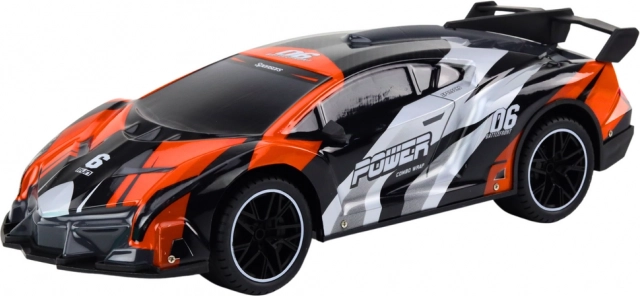 Der intuitive Zweistick‑Controller ermöglicht eine präzise Steuerung von Richtung und Geschwindigkeit. Die grau‑orange Sportkarosserie mit Schriftzügen und Heckspoiler fällt sofort ins Auge und unterstreicht den dynamischen Charakter des Fahrzeugs.