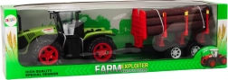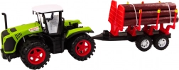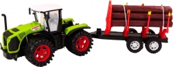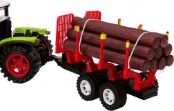 Der grüne Traktor mit roten Rädern und Holzstamm-Anhänger bietet das authentische Erscheinungsbild landwirtschaftlicher Technik und regt die Fantasie an.