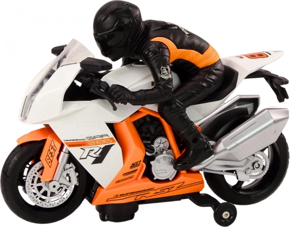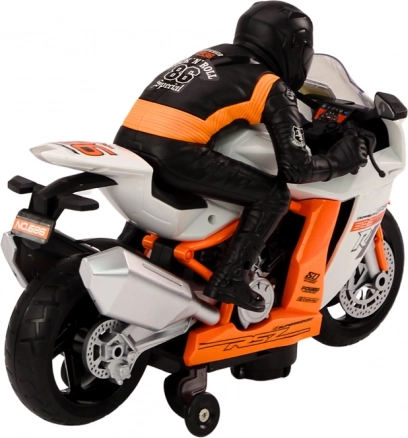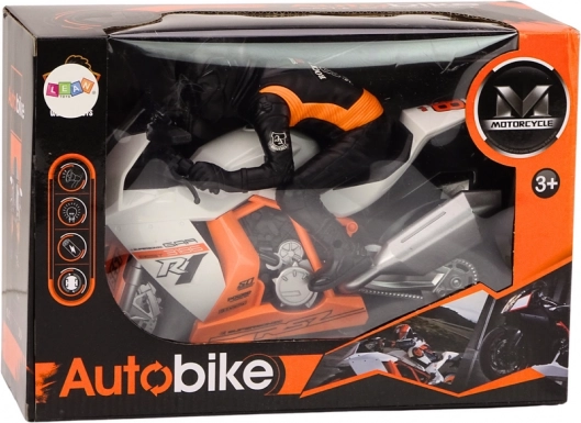 Das weiße Motorrad mit Fahrer ist ein dynamisches Spielzeug aus robusten Materialien, die Langlebigkeit und ein realistisches Erscheinungsbild gewährleisten. Jedes Stück ist sorgfältig mit großem Augenmerk auf Details gefertigt, was dem Motorrad Authentizität verleiht und es wie echt aussehen lässt. Die weiße Farbe mit orangefarbenen Elementen ist auffällig und verleiht ihm einen modernen und energiegeladenen Charakter. Die sorgfältig nachgebildete Figur des Motorradfahrers sorgt für ein realistisches Aussehen.