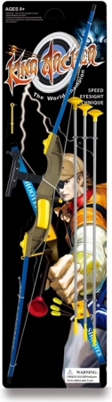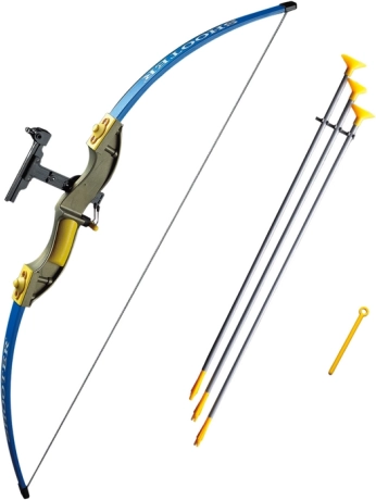 Das Set enthält einen beeindruckenden Bogen, der 102 cm lang ist und in attraktiven blauen Farben mit gelben und goldenen Akzenten gestaltet ist. Drei Pfeile in grau-gelber Farbkombination sind mit einem Gummisaugnapf versehen, was für sichere Verwendung sorgt und das Verletzungsrisiko minimiert.