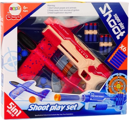.Ein 5-in-1-Spielzeug, das viel Spaß und vielfältige Spielmöglichkeiten bietet. Das Set besteht aus einer Pistole, einer Zielscheibe, Pfeilen und Schaumkugeln sowie einem Flugzeug. Dank seiner Vielseitigkeit und Innovation ermöglicht dieses Set viele kreative Spielarten und fördert gleichzeitig die manuellen Fähigkeiten und die motorische Koordination des Kindes.